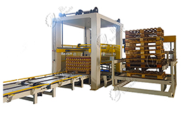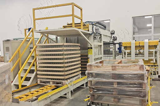 6)本機設(shè)計有空棧自動收集裝置,升降動力電機加以變頻控制,空棧托舉梁由氣缸帶動,可自動開合,碼垛整齊、方正。承載棧板數(shù)量可達12塊。