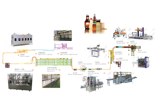 空瓶卸垛——洗瓶——自動濃醬灌裝機——玻璃瓶封口機——殺菌機——套標(biāo)機——貼標(biāo)機——開箱機——裝箱機——封箱機——碼垛機