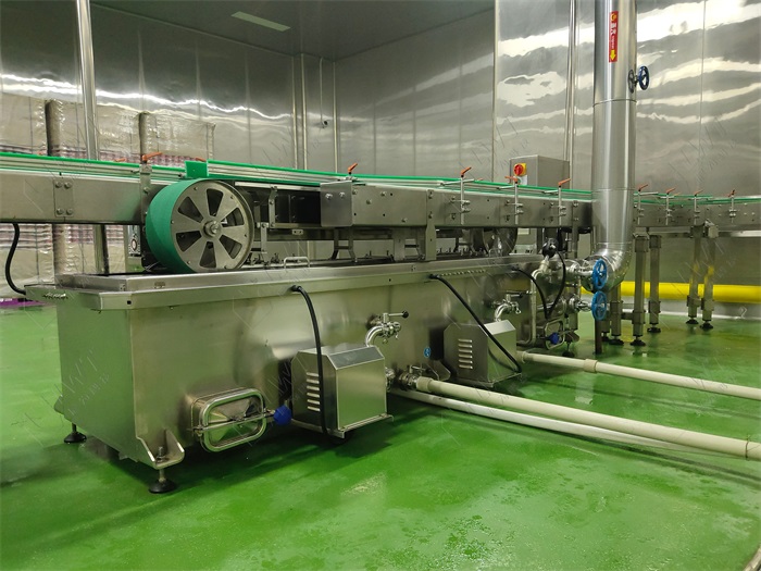 清洗 -> 2. 去皮 -> 3. 打漿/破碎 -> 4. 調(diào)配 -> 5. 融糖 -> 6. 均質(zhì) -> 7. 預熱 ->8. 空罐卸垛 -> 9. 空罐清洗(高壓噴淋) -> 10. 空罐吹干/瀝干 ->11. 自動灌裝 -> 12. 抽真空/蒸汽噴射(排除罐頂空氣) -> 13. 真空封口 ->14. 殺菌 -> 15. 冷卻 -> 16. 吹干(去除表面水漬)-> 17. 噴碼 -> 18. 貼標 -> 19. 自動開箱 -> 20. 自動裝箱 -> 21. 自動封箱 -> 22. 機器人碼垛 -> 23. 成品入庫