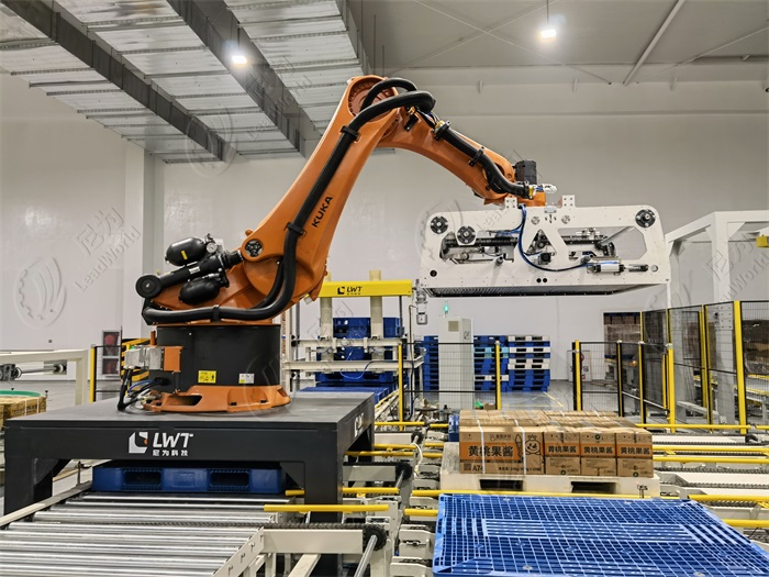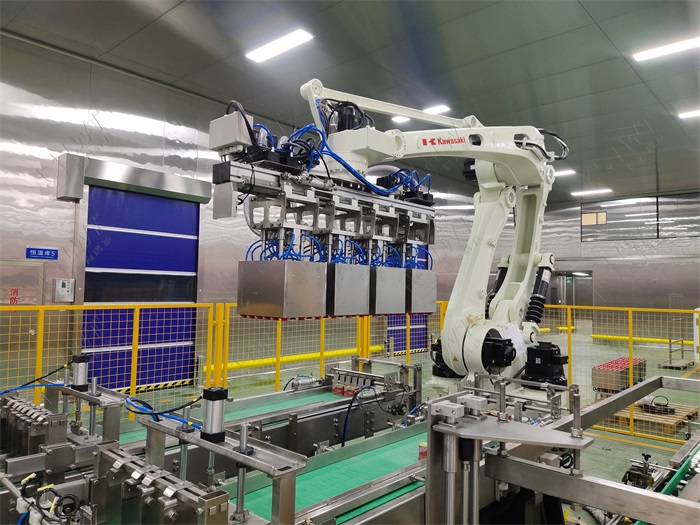 機器人碼垛機是機電一體化高新技術(shù)產(chǎn)品。可按照要求的編組方式和層數(shù),完成對料袋、膠塊、箱體等各種產(chǎn)品的碼垛。