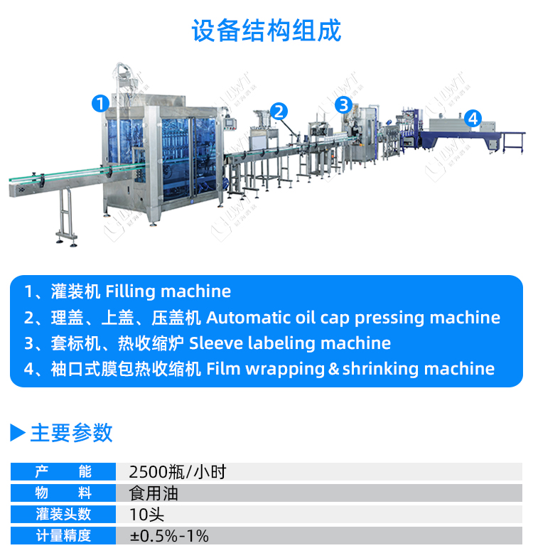 食用油灌裝生產線是食用油的關鍵設備,其自動化操作確保了產品質量與生產效率。一條完整的生產線主要包含活塞灌裝機、燈檢機、理蓋機、上蓋機、壓蓋機、套標機以及膜包熱收縮機等核心設備,可滿足不同規模油品生產企業的需求。