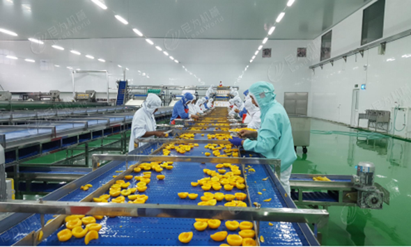 河北水果罐頭生產線項目包含前處理設備(從原料供應至淋堿去皮)—挑選線—自動卸垛機(玻璃瓶)--自動洗瓶機--自動罐裝機—自動碼垛機;該產線由尼為提供整套生產布局;